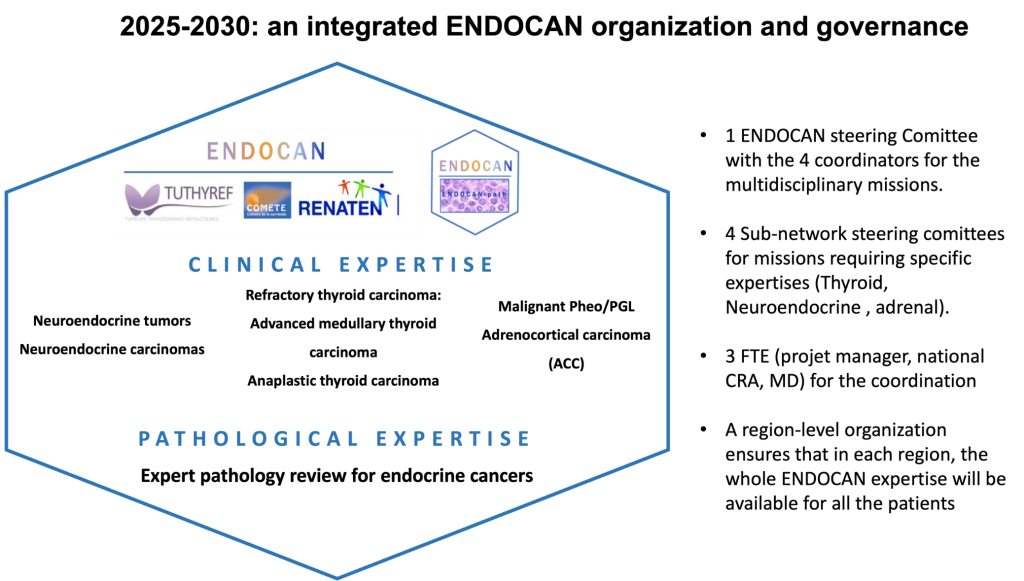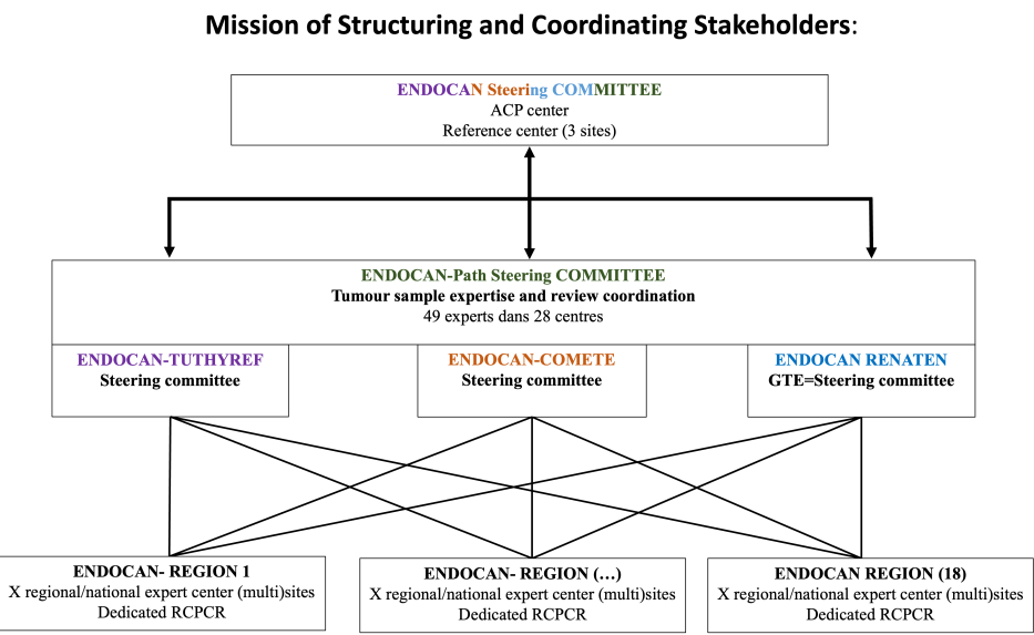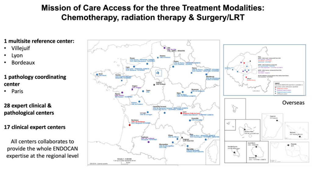 Il y aura : 3 centres nationaux cliniques (IGR ; Lyon et Bordeaux) et 1 centre national anatomopathologique (Paris). Le centre coordonnateur est l’IGR (Julien Hadoux) et les 3 centres de référence nationaux sont gérés par Julien Hadoux (IGR), Thomas Walter (CHU Lyon) et Magalie Haissaguerre (CHU Bordeaux).