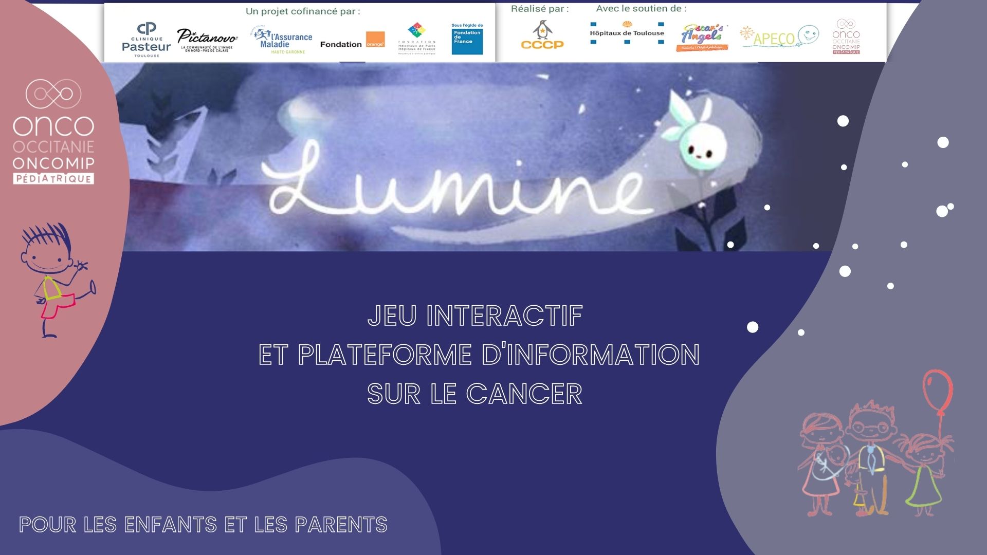 Lumine est avant tout une façon ludique de mieux appréhender la prise en charge Onco-pédiatrique en ex-Midi-Pyrénées, aussi bien pour les enfants que pour les parents. Ce Serious Game est un projet collaboratif des soignants et usagers des différentes structures de soins, afin de pouvoir répondre aux questions légitimes des familles et des enfants, dès leur arrivée dans une unité de cancérologie pédiatrique.
